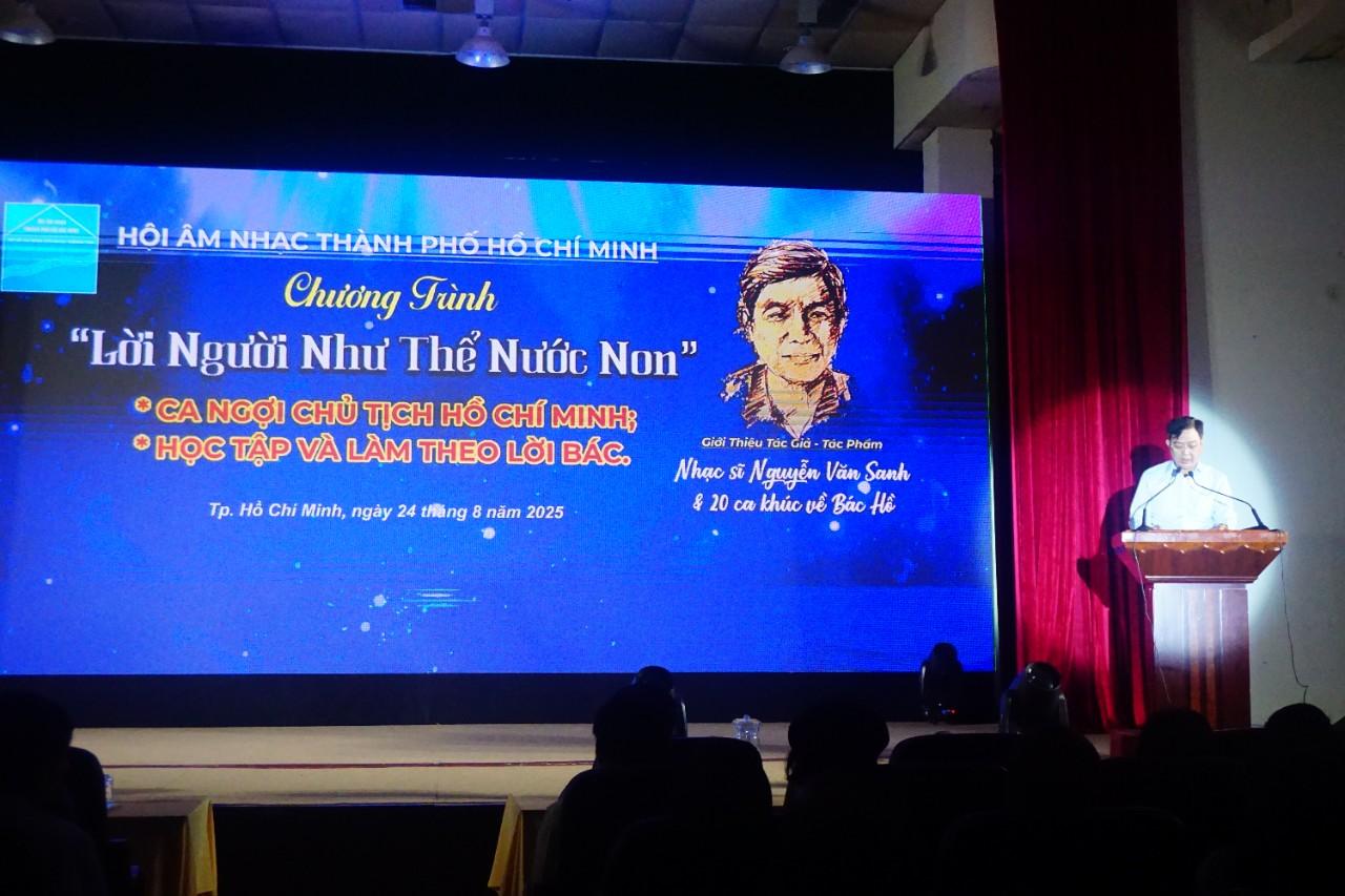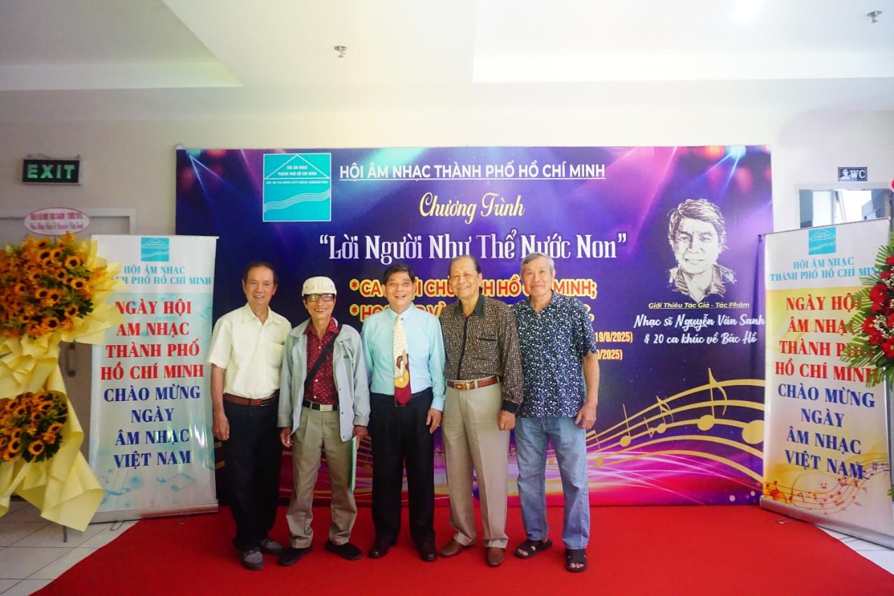 Sáng ngày 24/8/2025 tại Lầu 2 Tòa nhà Liên hiệp các Hội Văn học Nghệ thuật TP. Hồ Chí Minh đã diễn ra chương trình Giới thiệu Tác giả – Tác phẩm Nhạc sĩ Nguyễn Văn Sanh & 20 ca khúc về Bác Hồ với chủ đề “Lời Người Như Thể Nước Non” . Đây là chương trình do Hội Âm nhạc TP. Hồ Chí Minh và gia đình Nhạc sĩ Nguyễn Văn Sanh phối hợp tổ chức nhằm chào mừngcác ngày lễ lớn: Kỷ niệm 80 năm Cách mạng tháng Tám thành công, Quốc khánh nước Cộng hòa xã hội chủ nghĩa Việt Nam (02/9/1945 – 02/9/2025) và Ngày Âm nhạc Việt Nam (03/9).
